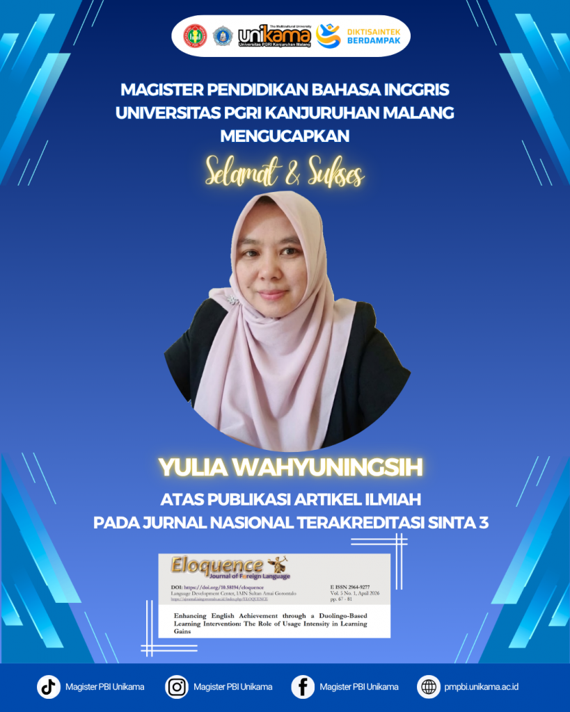 Pencapaian luar biasa ini diraih oleh Yulia Wahyuningsih, mahasiswa Program Studi Magister Pendidikan Bahasa Inggris Unikama. Publikasi ilmiah ini menjadi kado istimewa dan bukti nyata kualitas proses akademik di lingkungan pascasarjana Unikama. Artikel hasil riset Yulia telah resmi dipublikasikan dalam Eloquent Journal of Foreign Language, yang dikenal sebagai salah satu jurnal ilmiah bereputasi di bidang pendidikan bahasa di Indonesia.