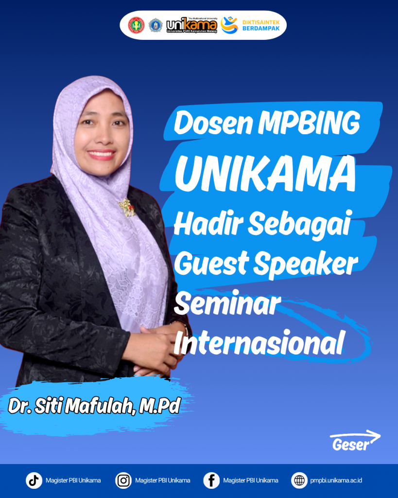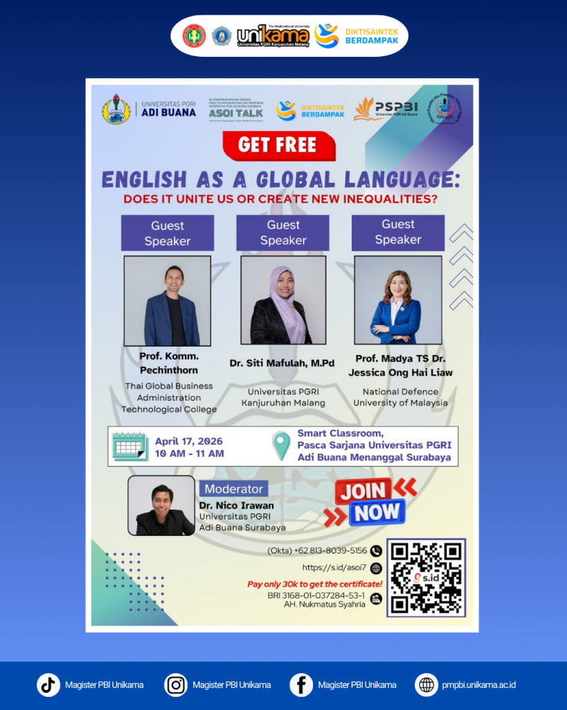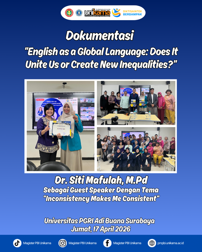 Dalam kegiatan tersebut, Dr. Siti Mafulah, M.Pd, dosen Magister Pendidikan Bahasa Inggris UNIKAMA, dipercaya untuk hadir sebagai guest speaker dalam seminar bertajuk “English as a Global Language: Does It Unite Us or Create New Inequalities?”. Seminar ini diselenggarakan pada Jumat, 17 April 2026, bertempat di Smart Classroom Pascasarjana Universitas PGRI Adi Buana Surabaya.