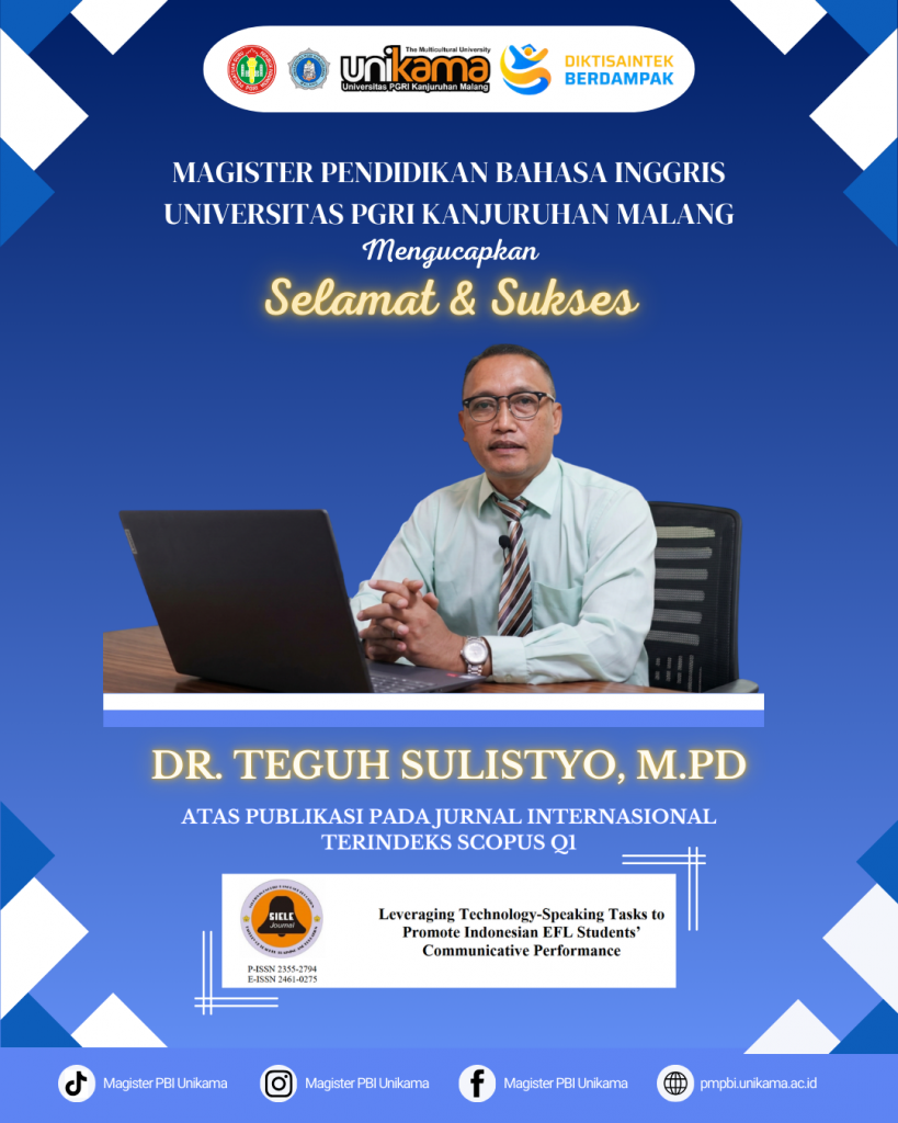 Program Studi Magister Pendidikan Bahasa Inggris Universitas PGRI Kanjuruhan Malang (UNIKAMA) kembali mencatatkan prestasi akademik melalui publikasi ilmiah pada jurnal internasional. Salah satu dosen Prodi Magister Pendidikan Bahasa Inggris, Dr. Teguh Sulistyo, M.Pd, berhasil menerbitkan artikel ilmiah pada jurnal internasional Studies in English Language and Education.
